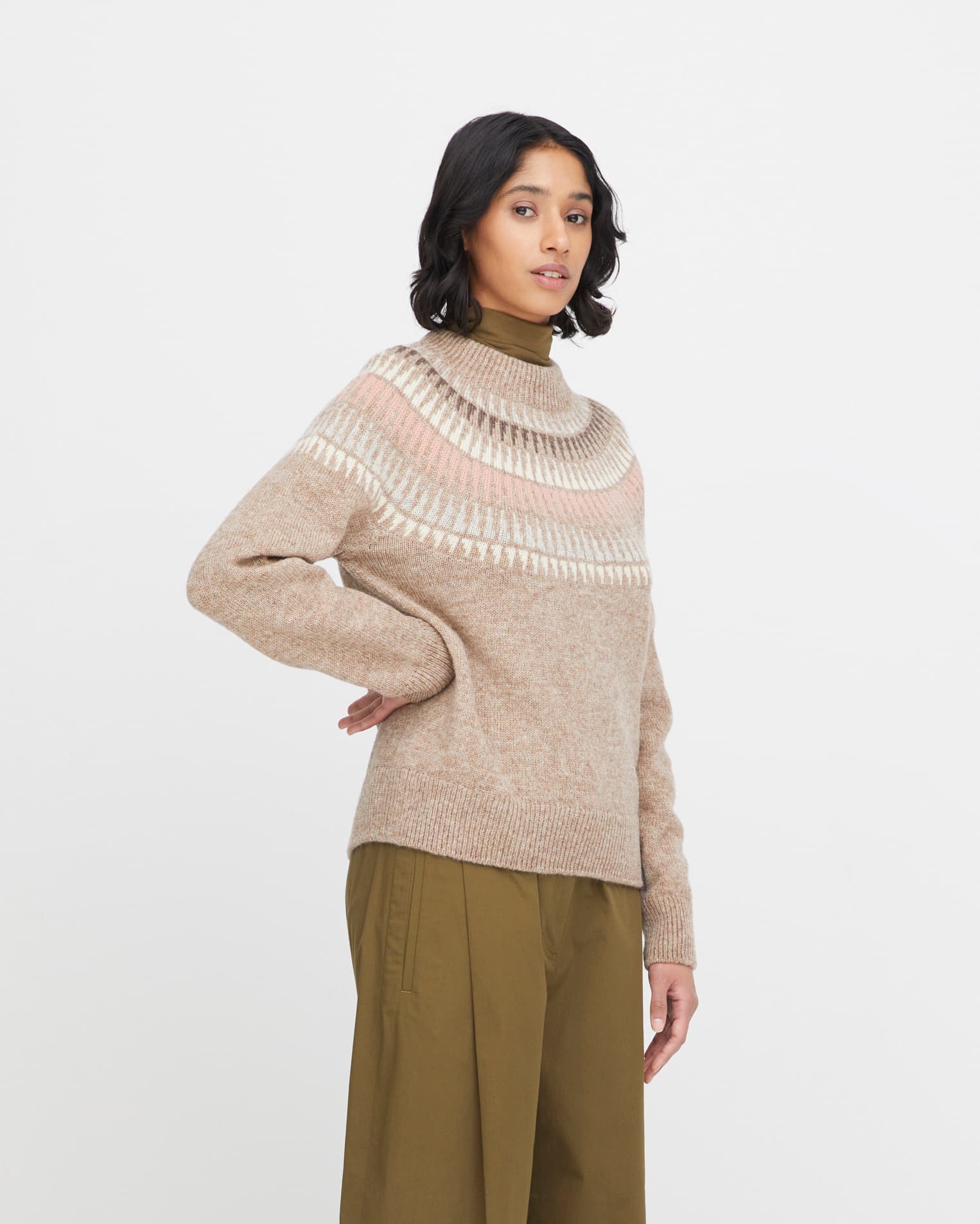 Alle fargerNavnet Spiret spiller på naturens former og spisse tinder. Genseren speiler balansen mellom tradisjon og innovasjon. Mønsteret bygger på norsk strikkearv, men med en lett og raffinert stil som gjør den til et plagg for vår tid. Spiret er et eksempel på hvordan tradisjonelle mønstre kan leve videre i moderne design.