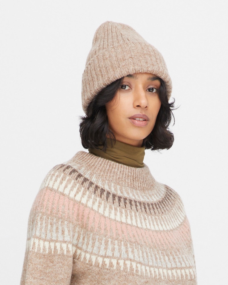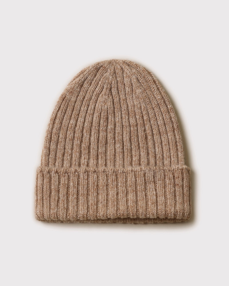 Velg mellom seks klassiske og anvendelige farger: svart, koksgrå, grå, midnattsblå, kamelbrun og beige melert. Luen er strikket i dobbel ribb.