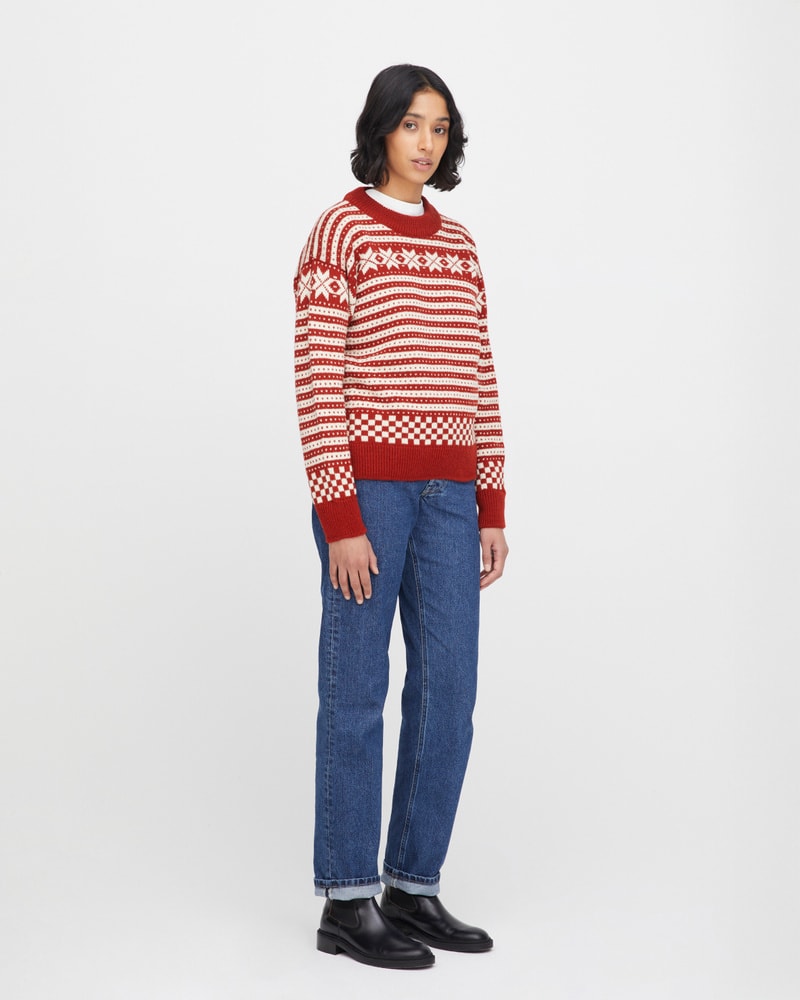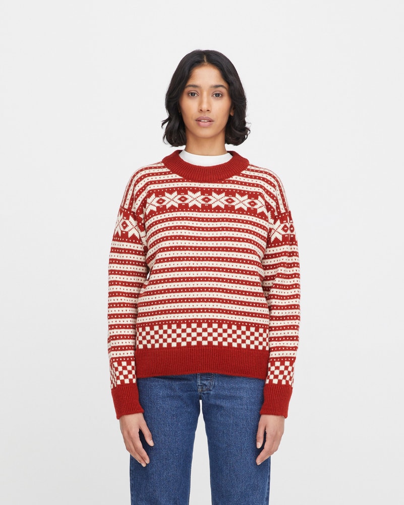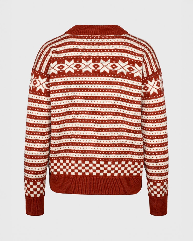 Genseren er strikket i norsk ull, som gir naturlig varme, god holdbarhet og fukttransport – perfekt for et norsk klima. Passformen er klassisk og feminin, med rund hals og et tidløst uttrykk som passer både til jeans og turklær.