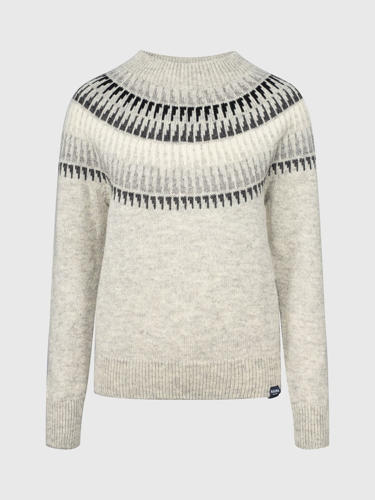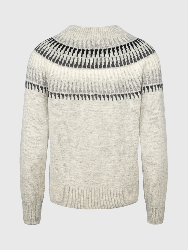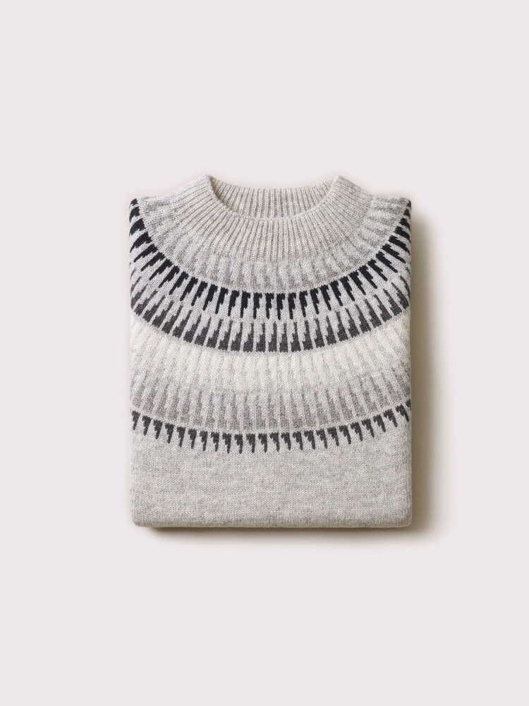 Spiret er en elegant og moderne ullgenser med mønster inspirert av norsk natur, fjell og tinder. Den strikkes i norsk ull og produseres i Romsdalen.