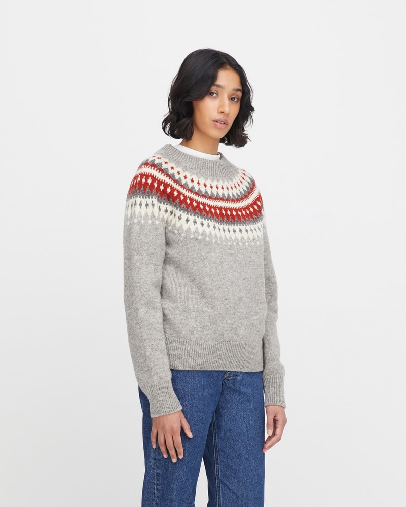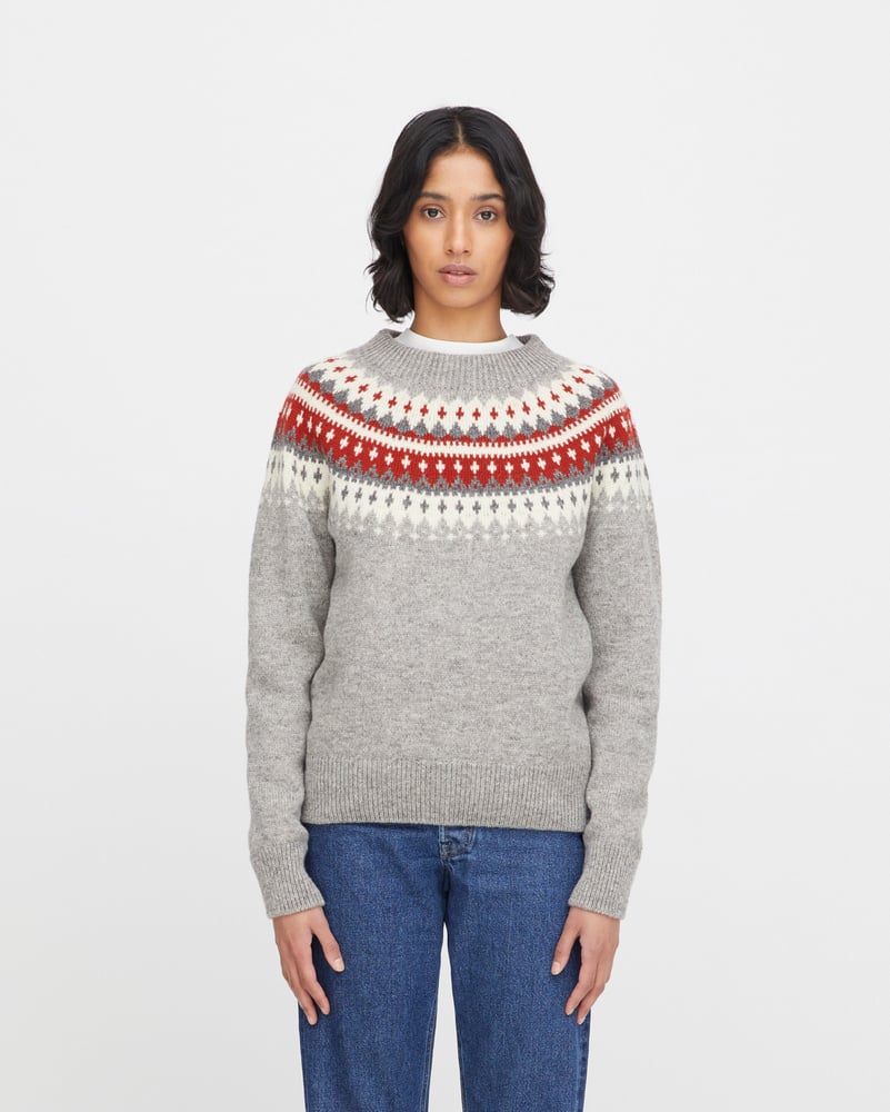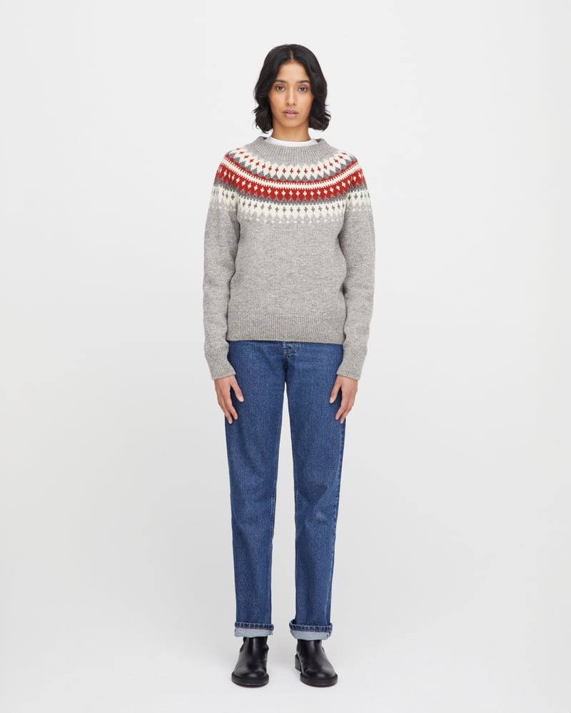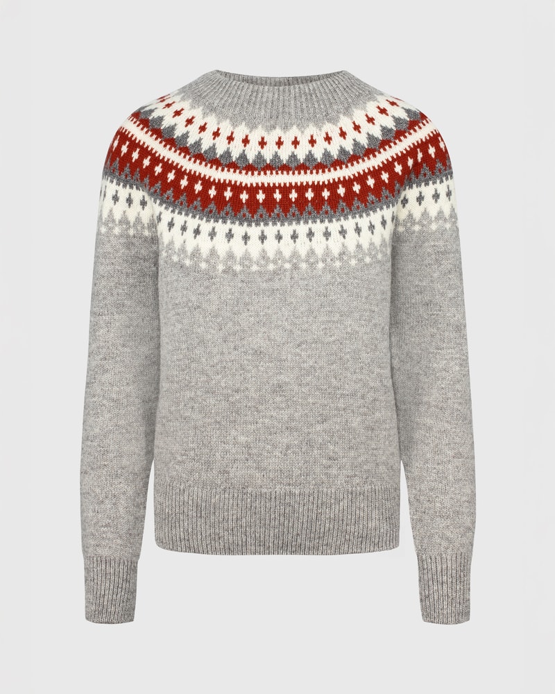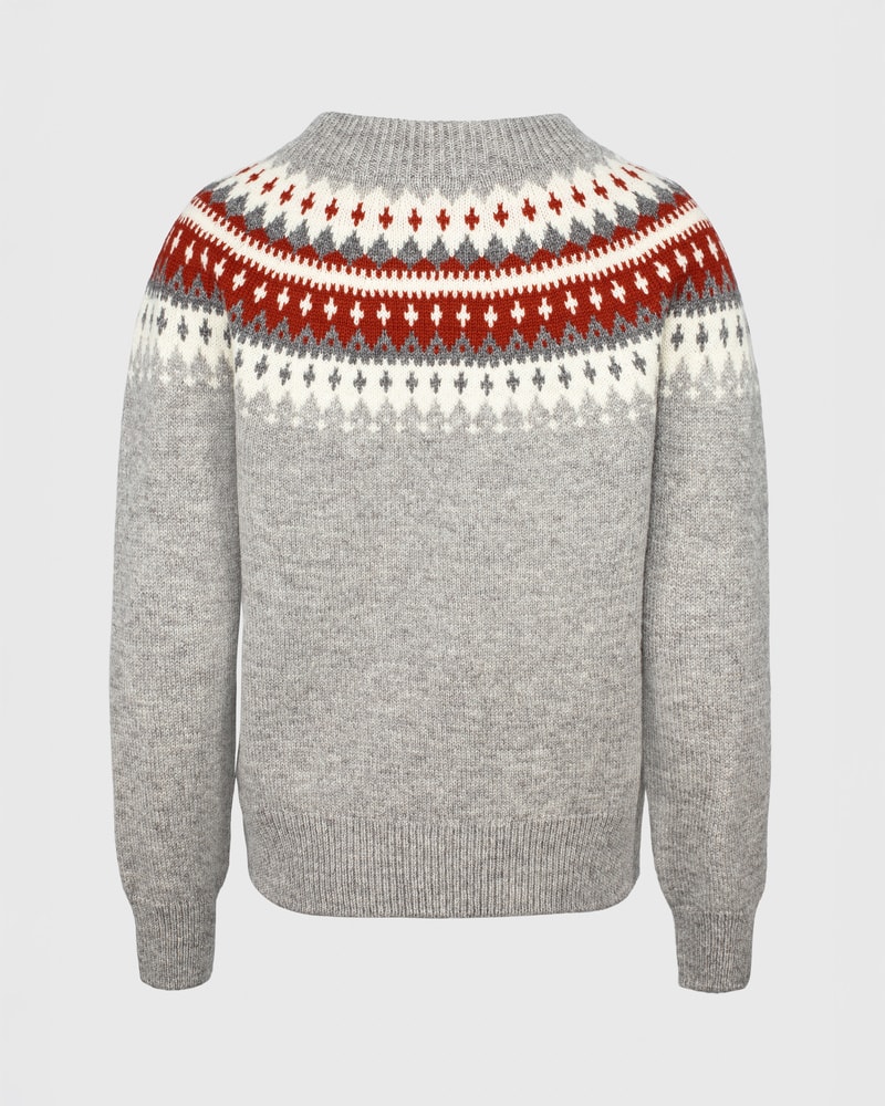 Varde er inspirert av gamle skisser fra arkivet vårt og oppdatert med et rent, moderne snitt. Velg mellom en grå genser med lune røde detaljer, en lys grå variant med delikate brune detaljer, en klassisk svart modell med kontrasterende hvite og grå mønstre, eller en grå genser med en varm gultone i mønsteret.