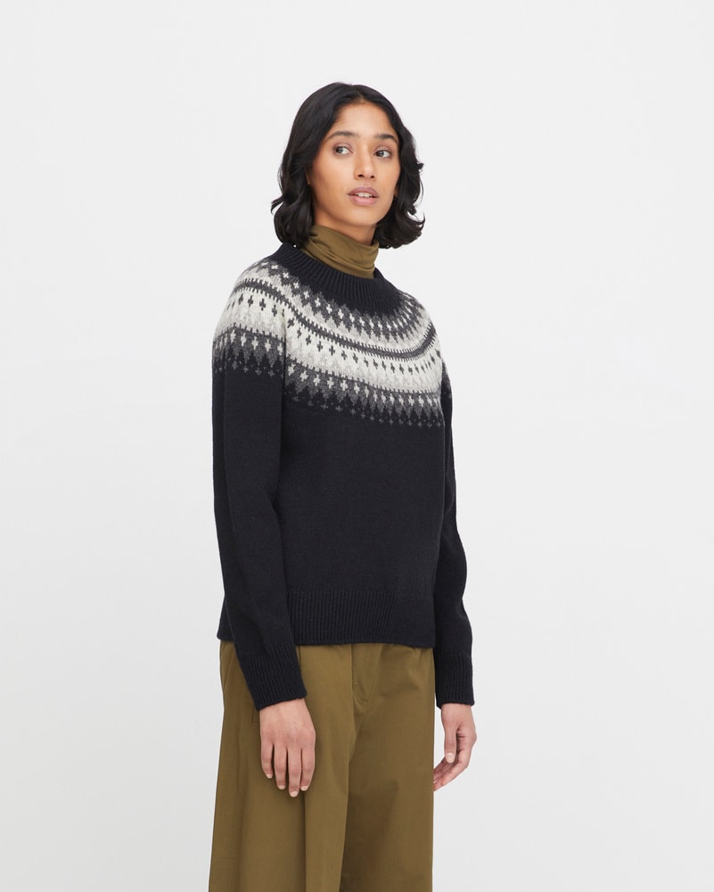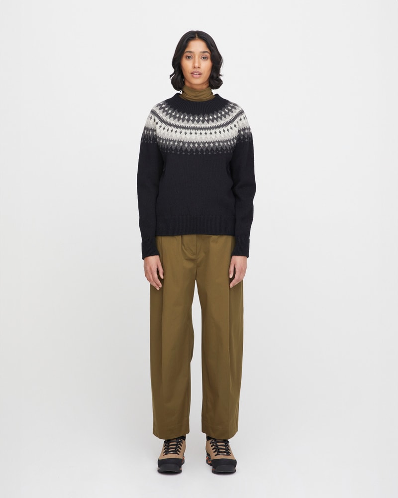 Varde er inspirert av gamle skisser fra arkivet vårt og oppdatert med et rent, moderne snitt. Velg mellom en grå genser med lune røde detaljer, en lys grå variant med delikate brune detaljer, en klassisk svart modell med kontrasterende hvite og grå mønstre, eller en grå genser med en varm gultone i mønsteret.